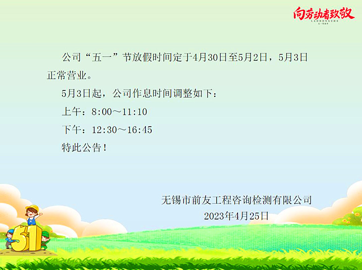 | 關(guān)于“五一”勞動節(jié)放假及節(jié)后營業(yè)時間調(diào)整的公告 | ||